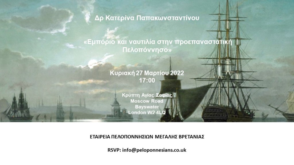 Η Εταιρεία Πελοποννησίων Μεγάλης Βρετανίας, σας προσκαλεί στην ετήσια ομιλία επ’ ευκαιρίας του εορτασμού της επετείου της 25ης Μαρτίου με θέμα: “Εμπόριο και ναυτιλία στην προεπαναστατική Πελοπόννησο”.